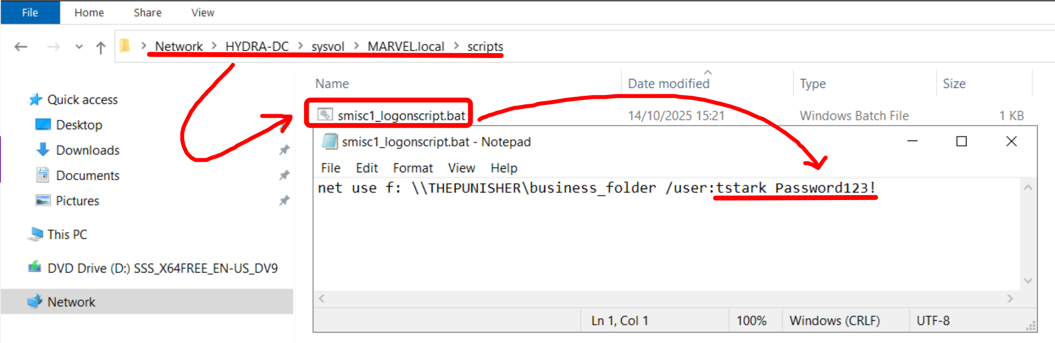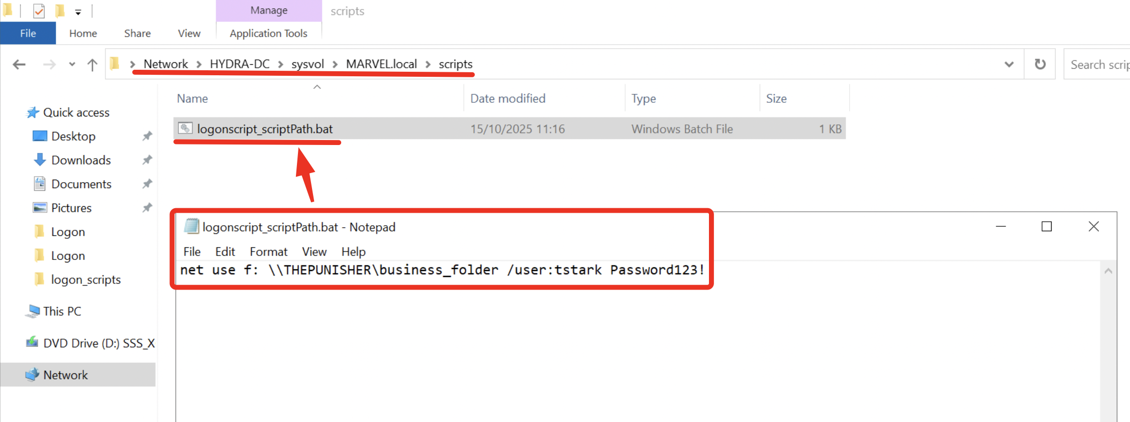 Indeed, as a further verification, if we manually inspect these “Automation Scripts” inside SYSVOL, we will find credentials hardcoded within the “net use” command.