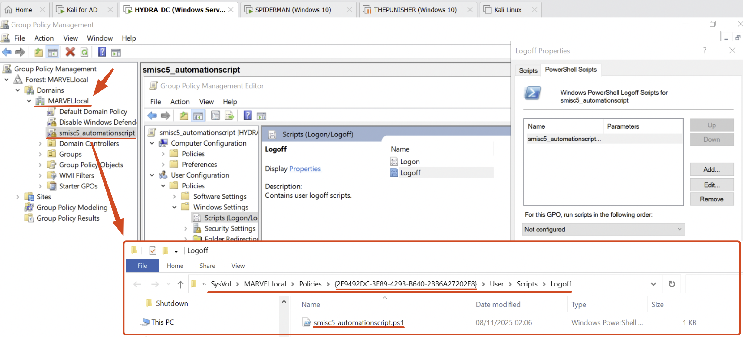 Subsequently, to determine which users are impacted by this “Automation Script” (in this case Logoff Script) and therefore identify the potential victims of the SMISC5 attack, as previously mentioned, the tester must enumerate this information manually for example using BloodHound; since the target in this example is within my home laboratory, we can observe how this GPO with that GUID is actually named “smisc5_automationscript” (DisplayName) and is directly associated with the MARVEL.local domain, it means that ALL domain user (because it is a Logoff Script) that perform a “Logoff” will become the victims of this attack.
