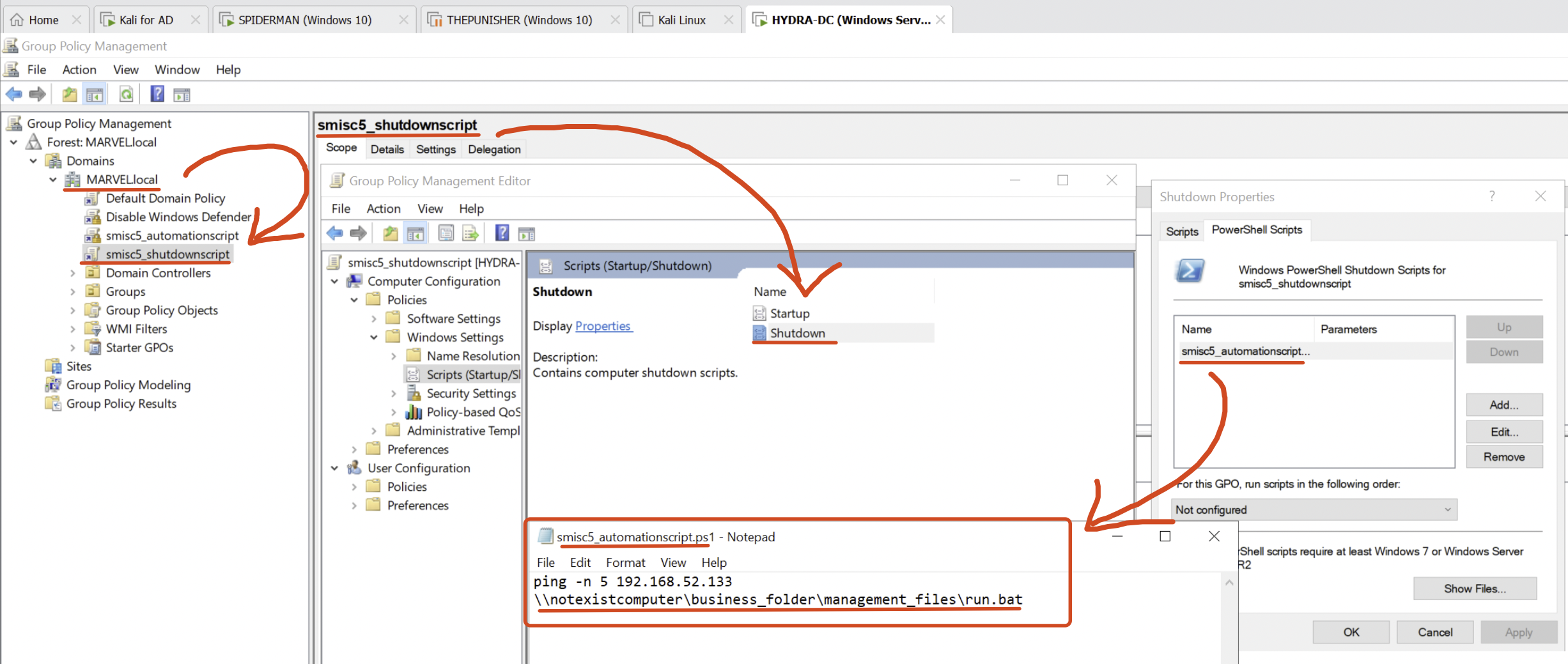 And there is a GPO associated with the entire domain that runs a Shutdown script which specifically executes the file “run.bat” located at \\notexistcomputer\business_folder\management_files\run.bat, furthermore, i want to highlight that this Automation Script is vulnerable to SMISC5 as previously discussed and in fact in this example for semplicity reason there is already an DNS A record that points the hostname “notexistcomputer” to the IP address of the attacker’s machine.