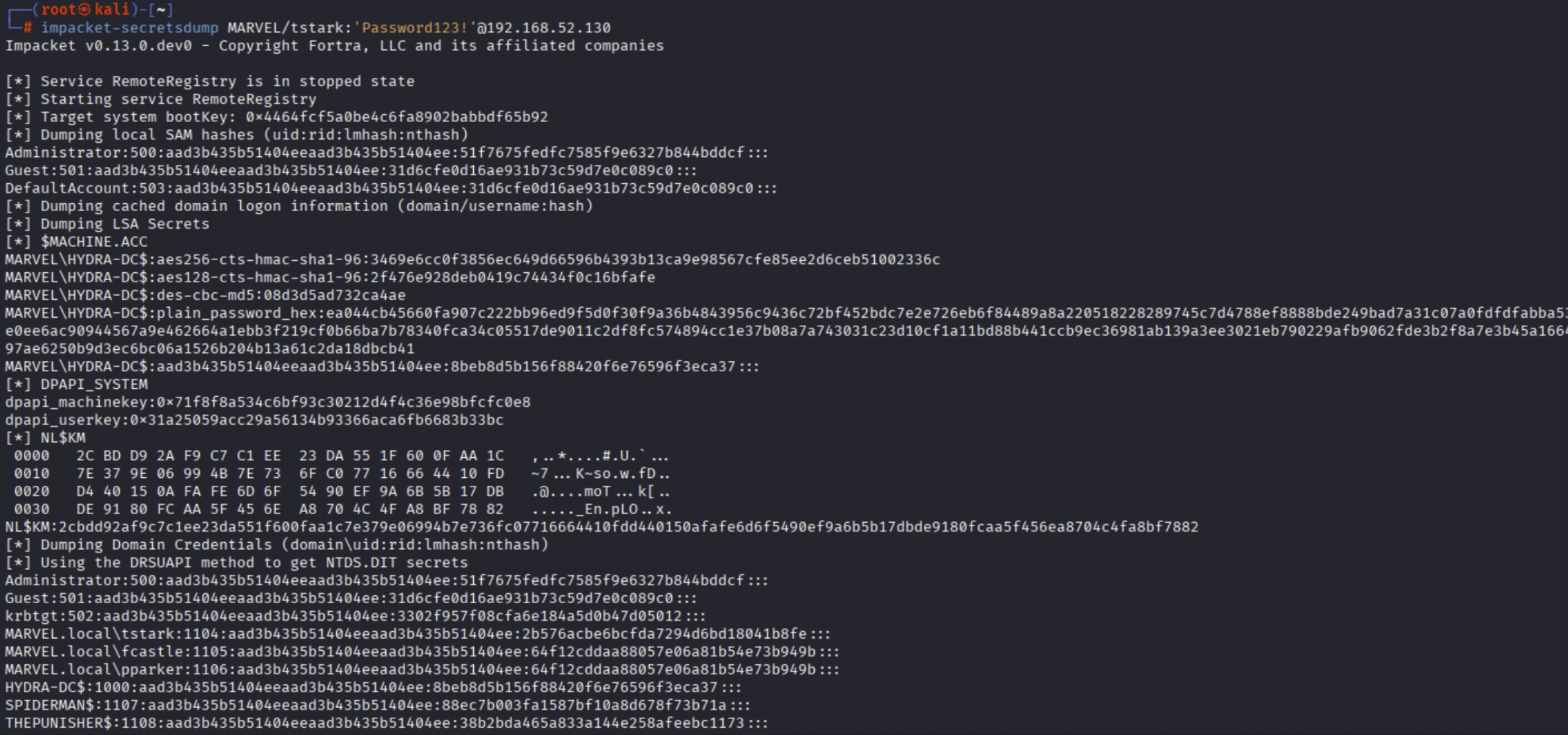 Based on the permissions assigned to the domain user retrieved, the attacker can proceed with further actions; in this case, “MARVEL\tstark” is a “Domain Admin” and consequently the attacker is able to compromise the entire domain.