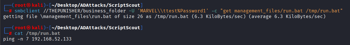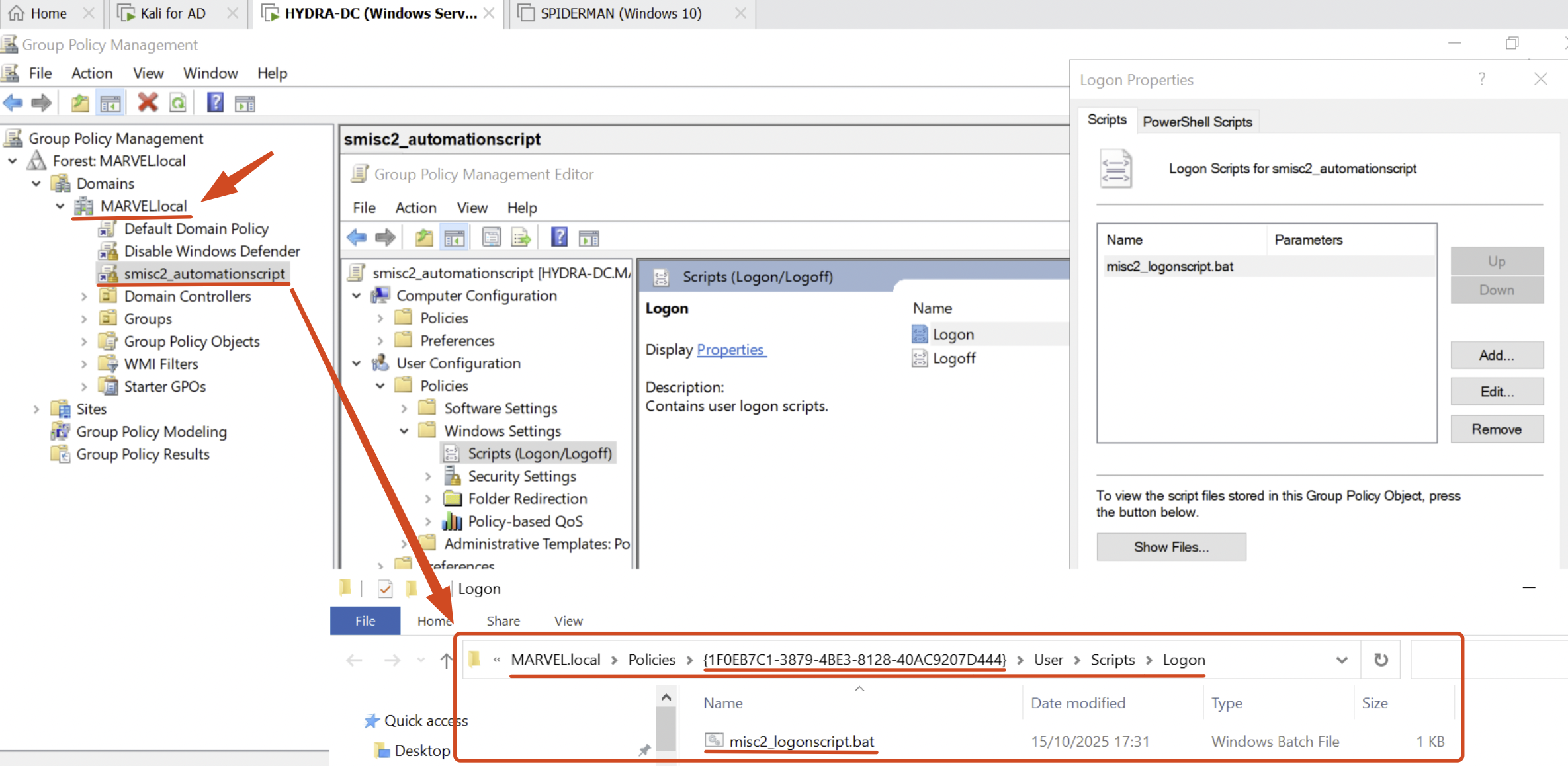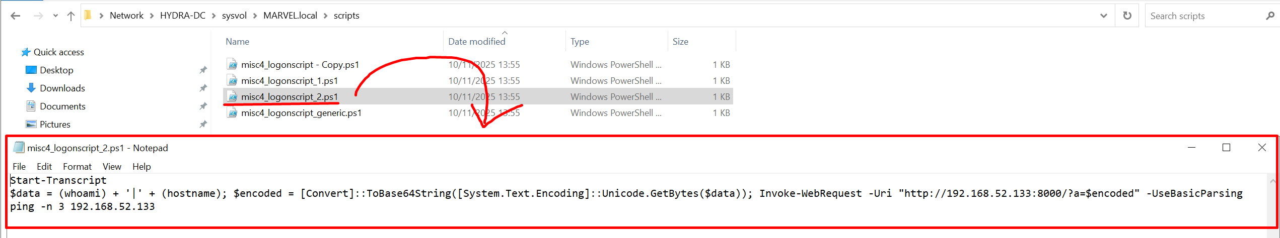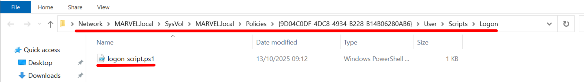 Now, every time the domain user “MARVEL\pparker” logs in on any domain joined machine, the machine where the user logs in will retrieve the Logon Script “logonscript_scriptPath.bat” located at \\<DC-hostname>\\NETLOGON\\