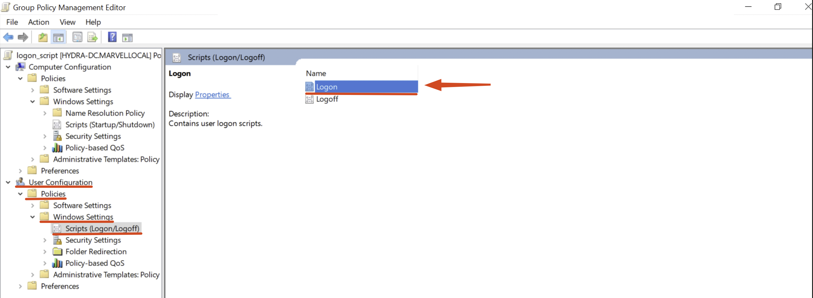 Then click “edit” and double-click on “User Configuration” -> “Policies” -> “Windows Settings” -> “Script (Logon / Logoff)” -> “Logon”