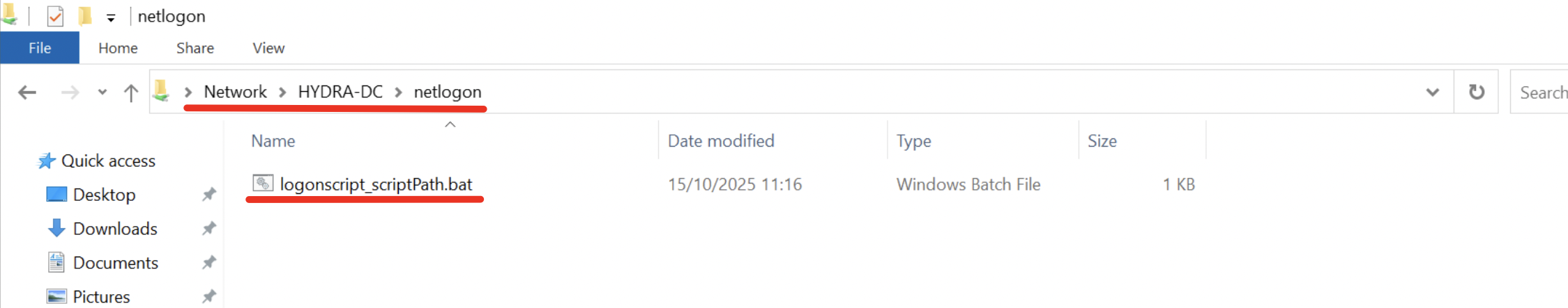 \\<DC-hostname>\SYSVOL\<domain>\script\” of the Domain Controller, in our scenario, the file “logonscript_scriptPath.bat” which maps a network share has been correctly inserted in this location.The supported extensions are “.bat”, “.cmd” and “.vbs” (from my tests, “.ps1” is not allowed).