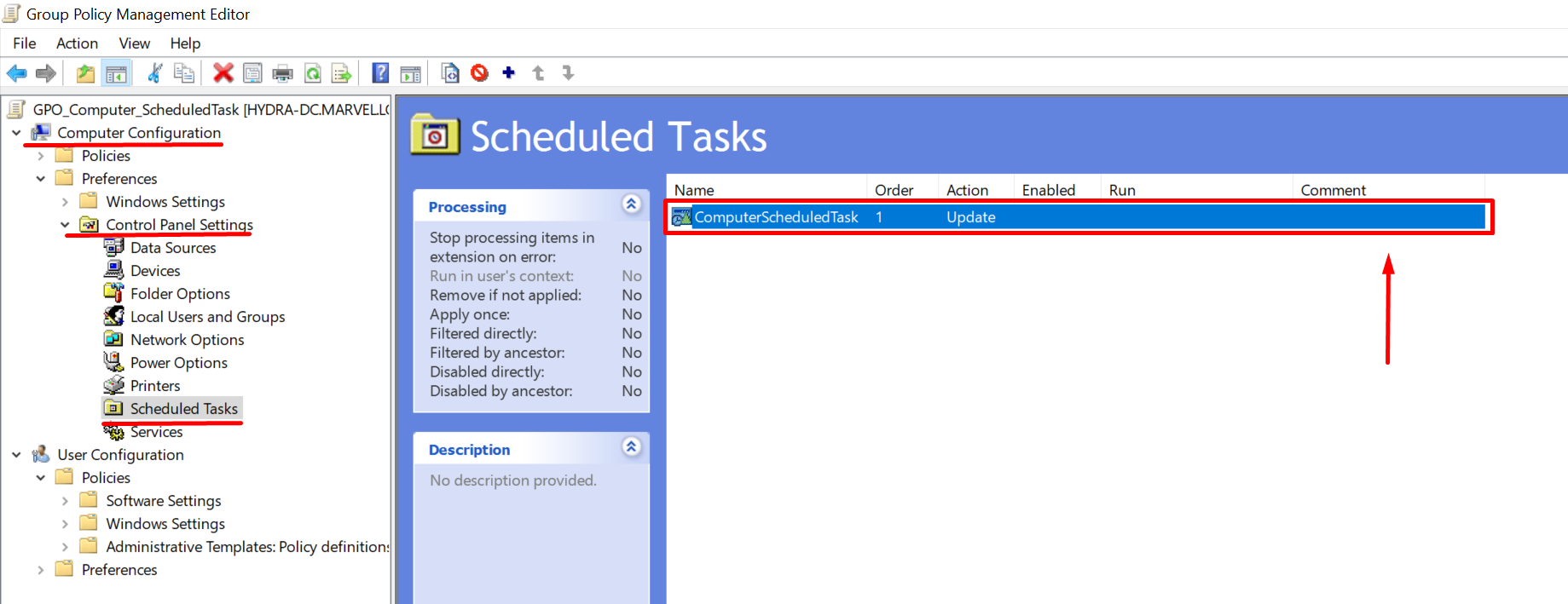 In this scenario, a GPO named “GPO_ComputerScheduledTask” is configured and associated with the entire domain and it sets up a Scheduled Task called “ComputerScheduledTask” for computers objects, so let’s analyze how it has been set up to understand its behaviour & eventually how to create a new one.