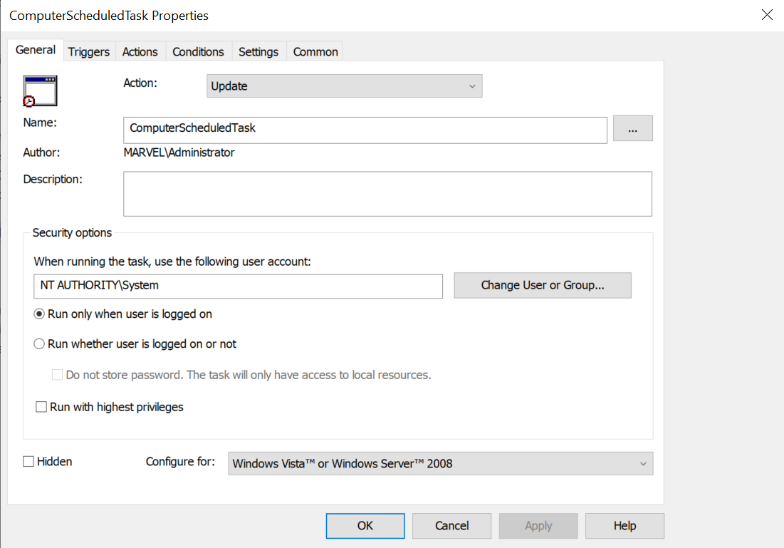 In our scenario, this Scheduled Task called “ComputerScheduledTask” will be executed with the local permissions of “NT Authority\System”.