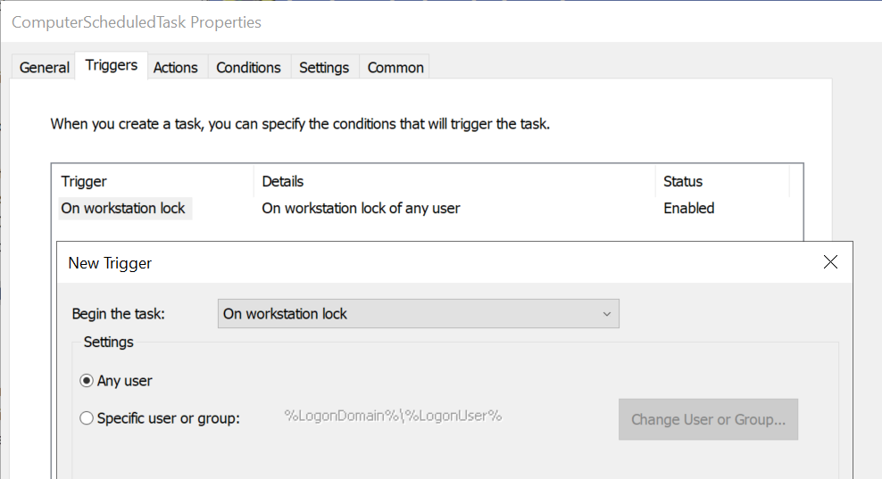 Specifically, it will be executed when an “On Workstation Lock” event occurs by any user, in other words, whenever any user locks the computer (affected by the “GPO Scheduled Task”), this Scheduled Task will be triggered.