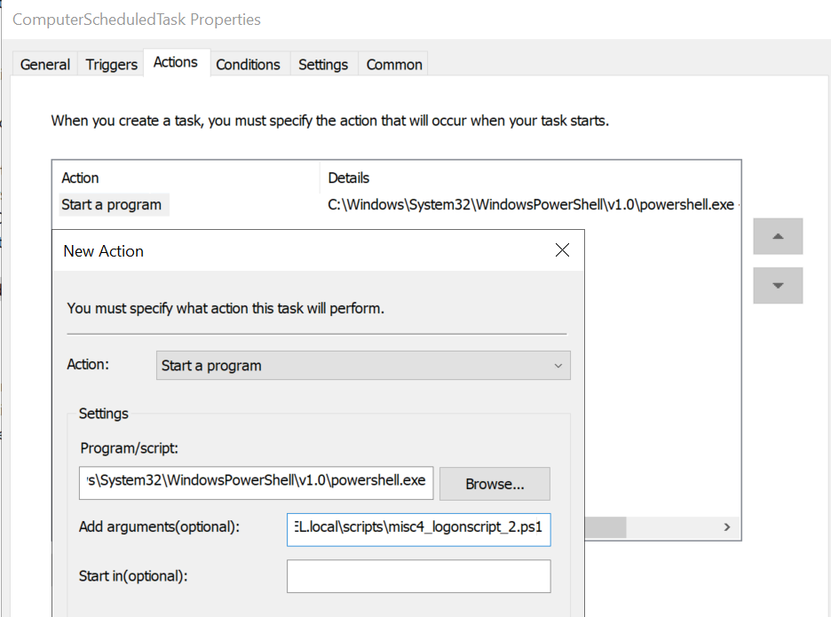 Once triggered, this “Scheduled Task” will execute a specific action, in this case, it will launch a program, specifically, it has been configured to execute “powershell.exe” running the file “misc4_logonscript_2.ps1” located in SYSVOL