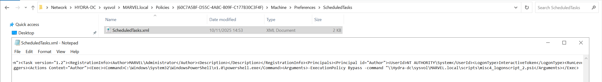 \\<dc_hostname>\SYSVOL\Policies\<GUID>\<Machine OR Users>\Preferences\ScheduledTasks\there will be a file named “Scheduled.Tasks.xml” which will detail the operation of the corresponding “Scheduled Task”, in this case, in fact, it’s possible to observe that the script named “misc4_logonscript_2.ps1” will be executed with the SYSTEM user: