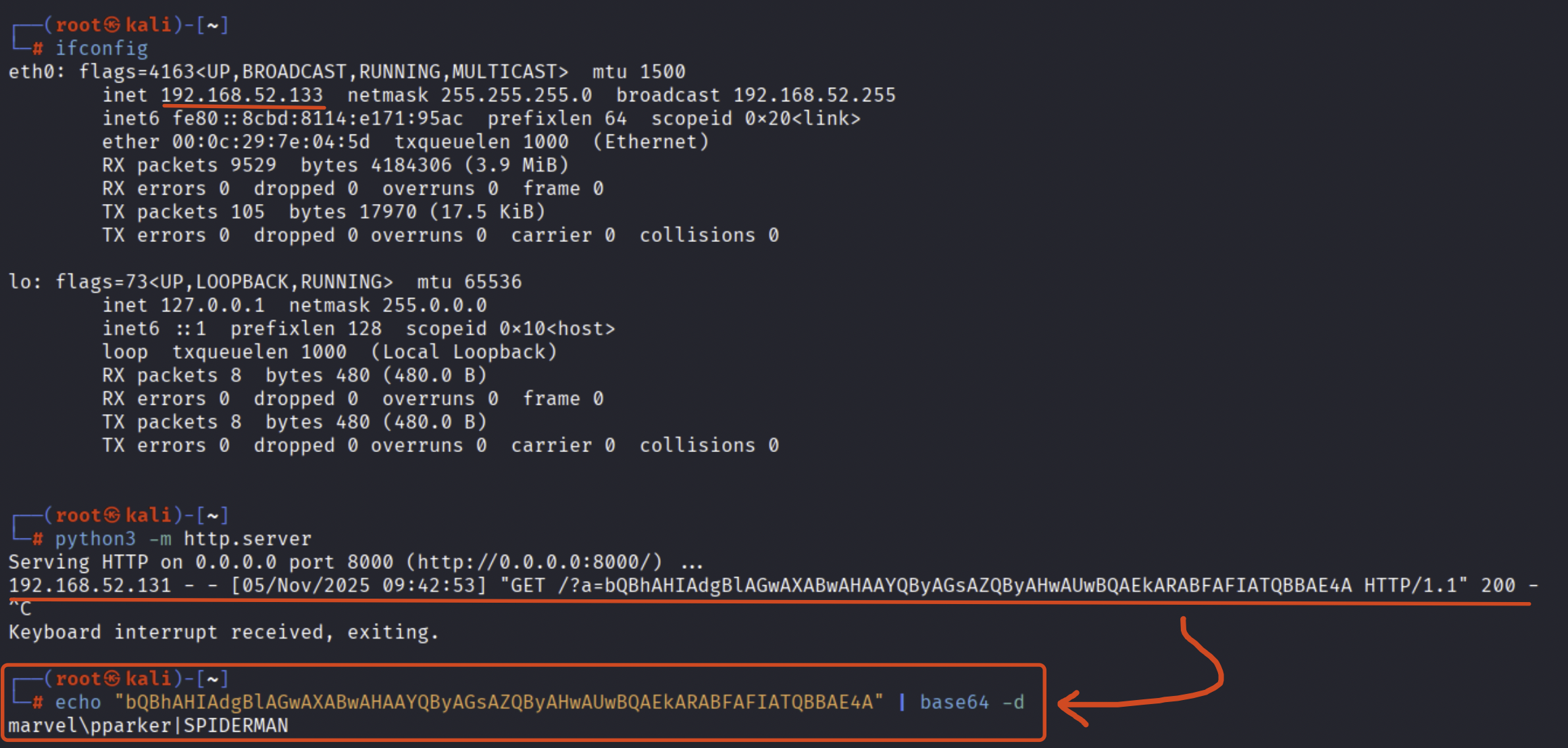 In our scenario, since this is a homemade lab, we will simulate the logoff interaction of the user “MARVEL\pparker” (it’s a Domain Admin) on the machine SPIDERMAN; consequently we will configure the tool “impacket-ntlmrelayx” to perform an SMB Relay towards the machine THEPUNISHER (since it’s a Windows 10 by default it does NOT have the SMB Signing enabled and therefore the attack will work), specifically towards the IP 192.168.52.132 (THEPUNISHER) and also configure it to save the Net-NTLM Hash obtained, which may potentially be used to perform Net-NTLM Hash Cracking afterward.