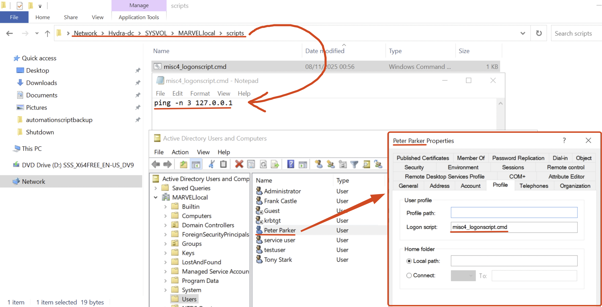 Now, every time the domain user “MARVEL\pparker” logs in on any domain joined machine, the machine where the user logs in will retrieve the Logon Script “logonscript_scriptPath.bat” located at \\<DC-hostname>\\NETLOGON\\