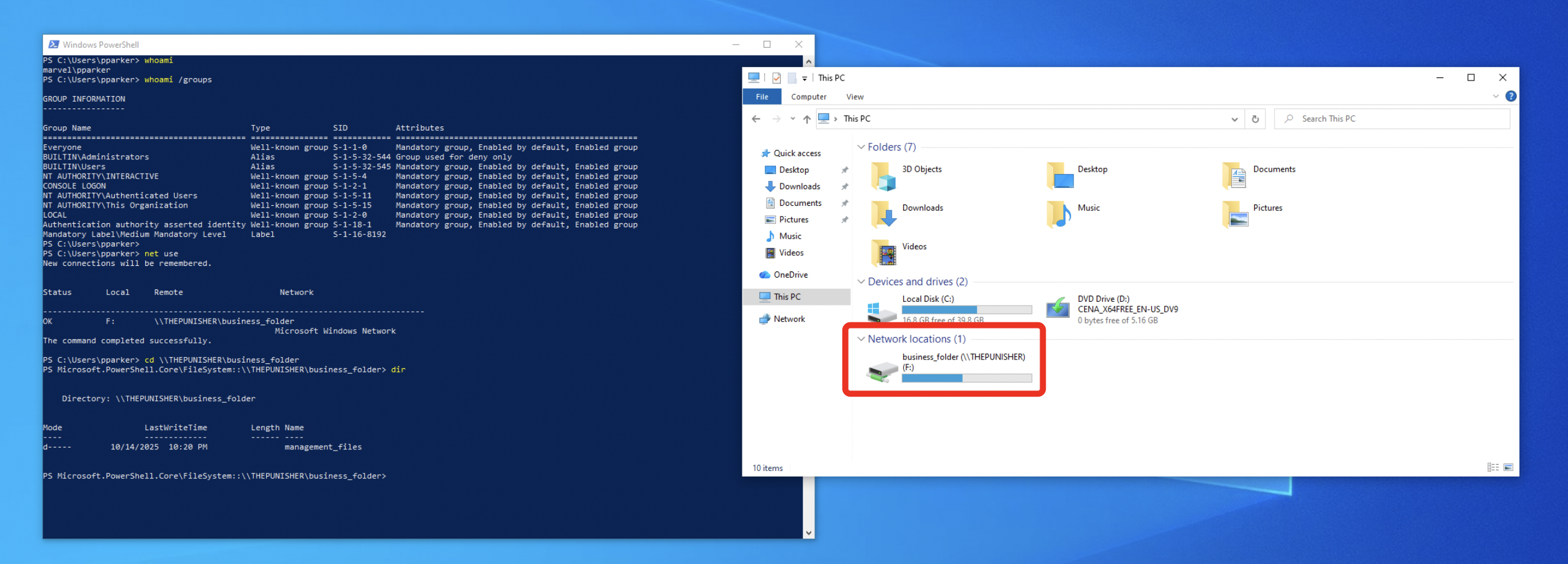 In our specific case, as soon as the user MARVEL\pparker authenticates on the SPIDERMAN computer (any computer where this domain user “MARVEL\pparker” could log in would work), the network share “business_folder” hosted on the machine THEPUNISHER will be automatically mapped.